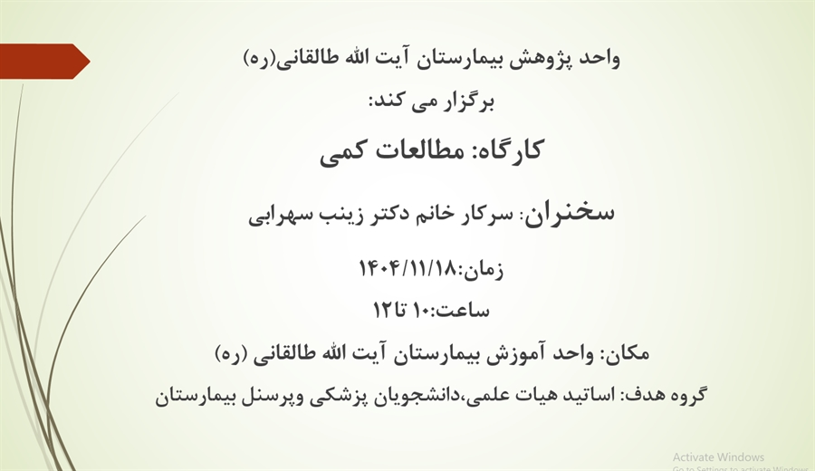 کارگاه مطالعات کمی توسط دکتر زینب سهرابی در تاریخ 1404/11/18 در واحد تحقیقات بالینی بیمارستان طالقانی برگزار