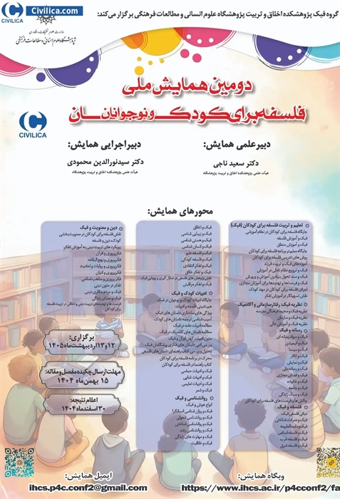 دومین همایش ملی فلسفه برای کودکان و نوجوانان در تاریخ ۱۲ اردیبهشت ۱۴۰۵ توسط پژوهشگاه علوم انسانی و مطالعات فرهنگی، در شهر تهران برگزار خواهد شد.با توجه به اینکه این همایش به صورت رسمی برگزار می گردد، کلیه مقالات این کنفرانس در پایگاه سیویلیکا و نیز کنسرسیوم محتوای ملی نمایه خواهد شد و شما می توانید با اطمینان کامل، مقالات خود را در این همایش ارائه نموده و از امتیازات علمی ارائه مقاله کنفرانس با دریافت گواهی کنفرانس استفاده نمایید.